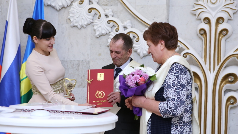 Specialists of Wedding palace have congratulated Dmitry Antonovich and Vera Ivanovna on a significant event, have wished good health, and happiness, have handed a greeting card from the Head of the Nizhnekamsk district, the mayor of Nizhnekamsk Aydar Raisovich Metshin, the Honourable act of the Registry Office and an anniversary medal. The names of spouses of Yanyo are included in the Book of Honour of the Nizhnekamsk Registry Office.