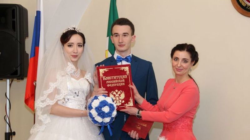 During the solemn registration of marriage, the leading ceremony presented the young spouses with the Constitution of the Russian Federation-a symbol of statehood as a gift.