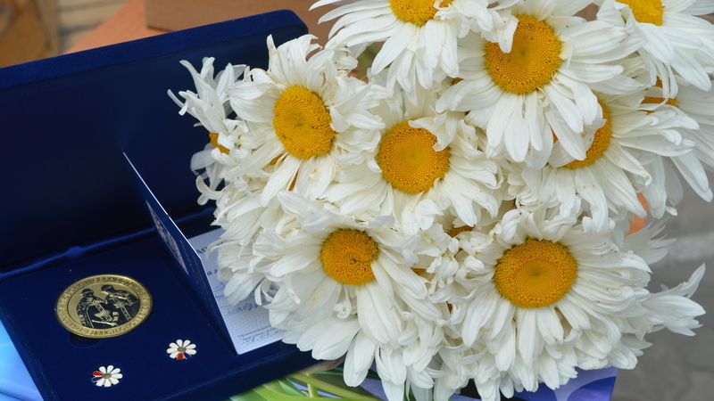 Guests of the event were greeted by snow-white flags with ornaments of wild flowers of daisies, which are a symbol of this holiday.