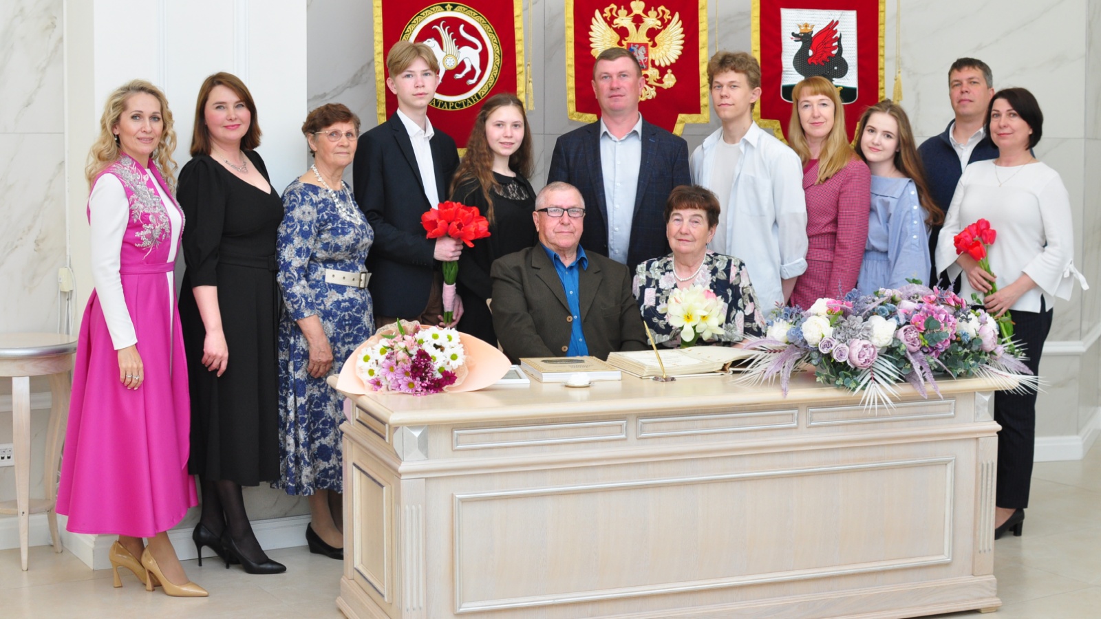 From the Registry Office of Kazan, the anniversaries were presented with a certificate of the celebration of the golden jubilee. In a solemn atmosphere, the couple put their signatures in the Book of Honor of the Kazan Family Center.