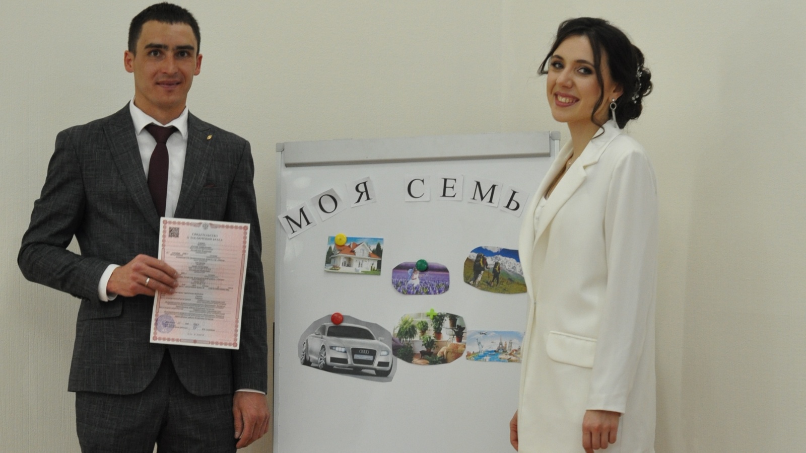 The newlyweds were asked to create a family wish card. The specialists of the department have prepared an easel and bright pictures related to family hobbies, hobbies, travel. The family wish card is a colorful composition that helps a person to tune in to the fulfillment of their desires. The newlyweds visualized their desires and dreams together in the form of pictures.
