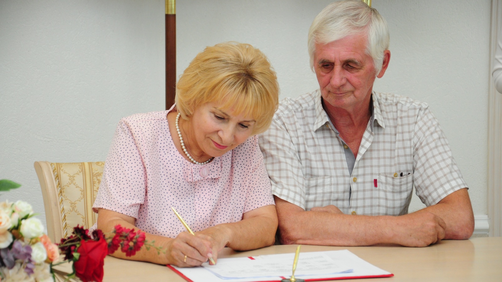 On behalf of the Mayor of Kazan Ilsur Metshin, congratulatory addresses and gifts were presented to the anniversaries at the ceremony. The anniversaries received bouquets of chrysanthemums from the Registry Office of Kazan. At the end of the celebration, the chief specialist of the marriage registration department, Adil Ibragimova, performed the song «Weather in the House» as a musical gift, to the sound of which the spouses prettily danced…