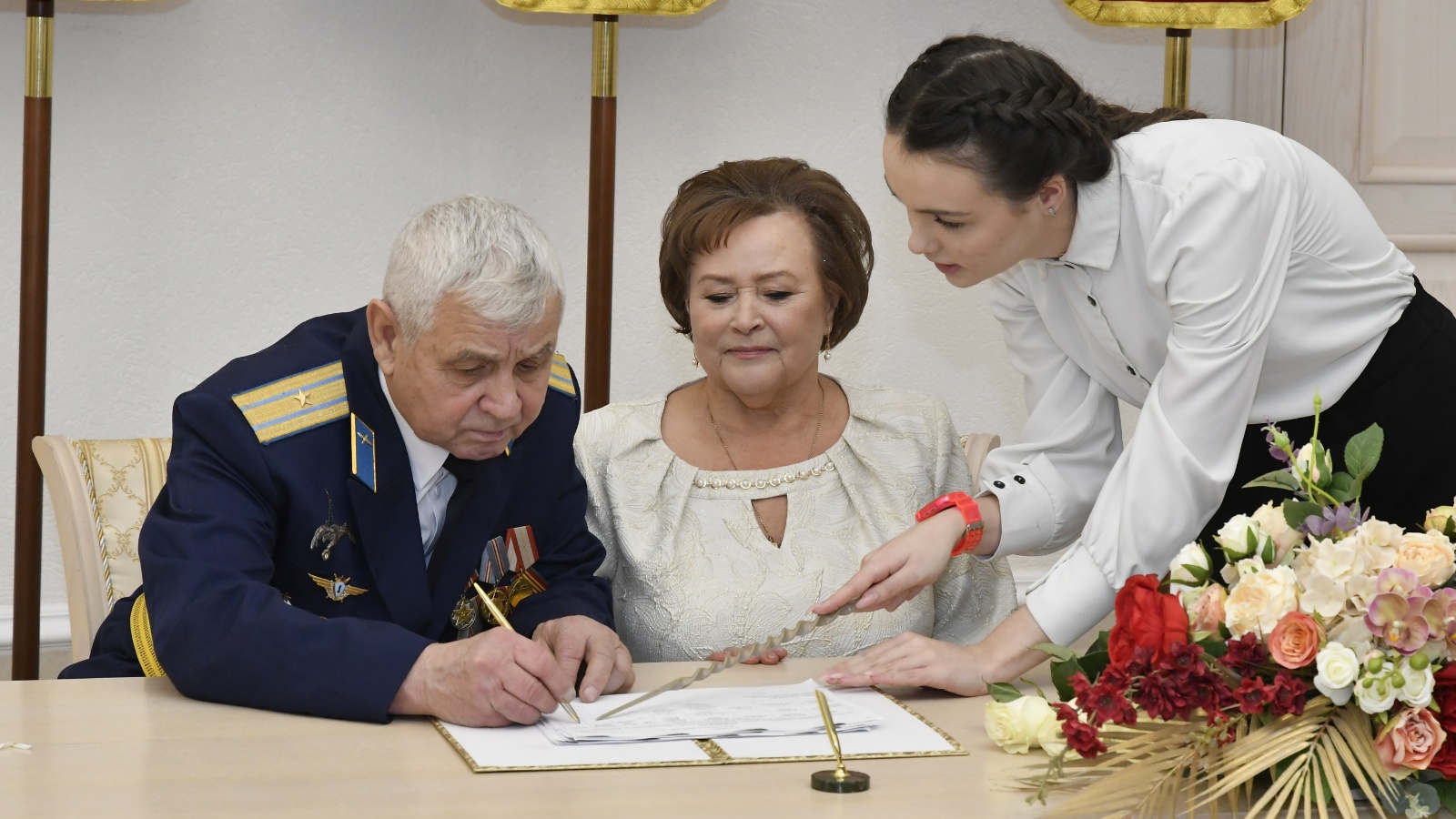In a solemn atmosphere, 8 married couples were congratulated on this significant event. Children, grandchildren, great-grandchildren and friends of the anniversaries came to share the joyful event. On behalf of the Mayor of Kazan Ilsur Metshin, a congratulatory address and a monetary gift were presented at the ceremony.