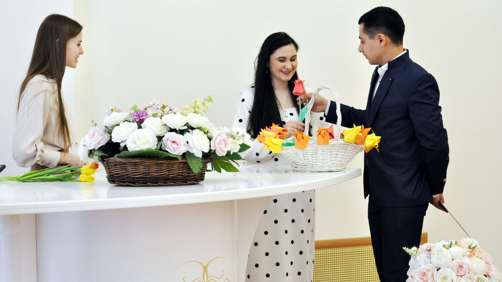 On March 7, 2023, a festive event was held in the Department of the Registry Office in the Volga region. At the state registration of marriage, the grooms presented their brides with tulips made in the origami technique, on which they wrote the words of recognition. Employees of the registry office department handed flowers to the brides.