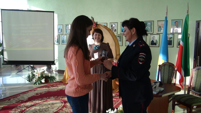 Поздравительные и напутственные слова прозвучали в адрес юных граждан России от начальника отдела по вопросам миграции МВД России по Рыбно-Слободскому району – Альмухаметовой Альфии Мухаметзяновны.
