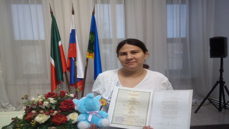 Начальник отдела ЗАГС Елена Халикова поздравила маму с рождением дочки и вручила свидетельство о рождении, памятный подарок и поздравительная открытка от имени Президента РТ Р.Н. Минниханова.
