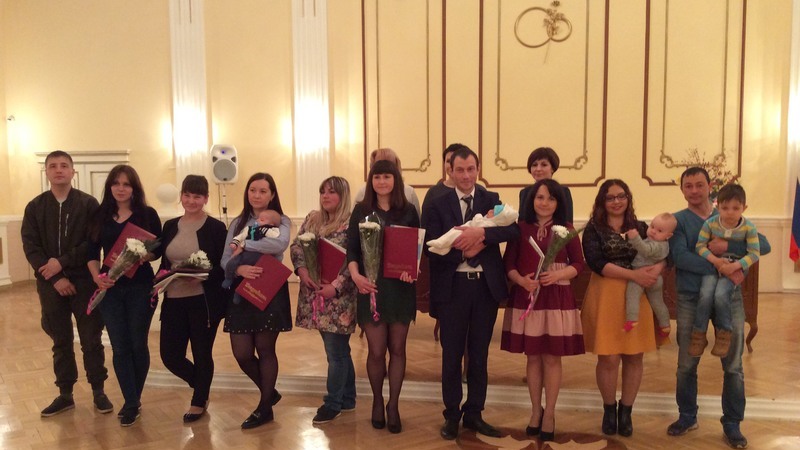В торжественной обстановке Начальник ОЗАГС Элла Ивановна Демченко и заместитель начальника Управления Пенсионного Фонда в г. Бугульма Елена Михайловна Латыпова совместно с начальником дополнительного офиса «Газпромбанка» Еленой Николаевной Бобровой вручили сертификаты семи супружеским парам и пожелали молодым семьям крепкого здоровья, любви и процветания.