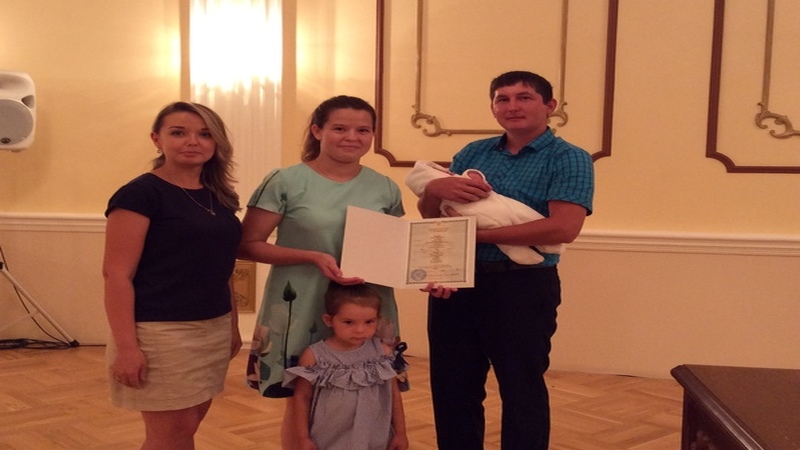 Сотрудники отдела ЗАГС поздравили родителей с рождением дочери и в зале торжеств, вручили первый документ в жизни Малики Маннаповой – свидетельство о рождении и памятную поздравительную открытку.