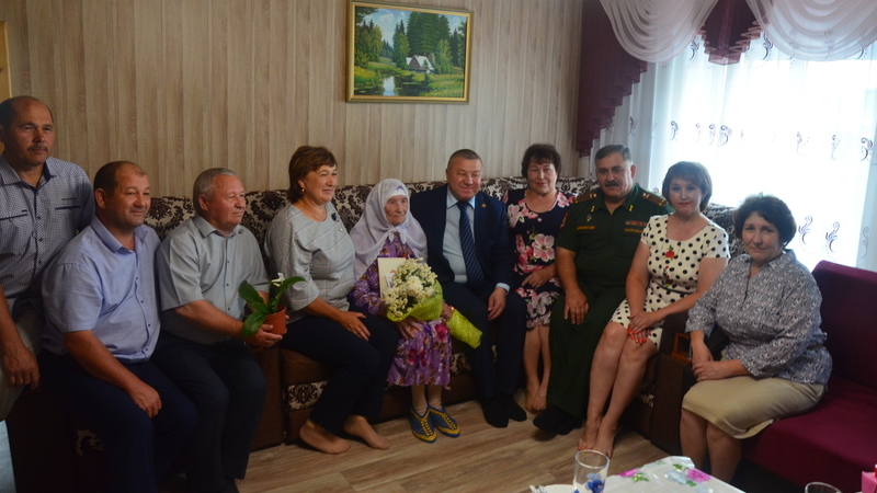 Поздравить её с вековым юбилеем пришли глава Сармановского района Фарит Хуснуллин, военный комиссар Дашгын Гаджиевич, директор агрофирмы «Нуркеево» Вазих Гильметдинов, глава сельского поселения Раушания Исламова, председатель Совета ветеранов Назип Миннегулов, начальник социальной защиты Лилия Гильмутдинова, директор КСЦОН «Шафкать» Гульнара Хузина, руководитель пенсионного фонда Асылъяр Харисов, руководитель отделения партии «Единая Россия» Гулюса Харисова, а также дети, внуки, правнуки родные и близкие юбилярши. Фарит Мунавирович вручил поздравительное письмо Президента Российской Федерации В. В.Путина, пожелал ей самые искренние поздравления и вручил памятный подарок.