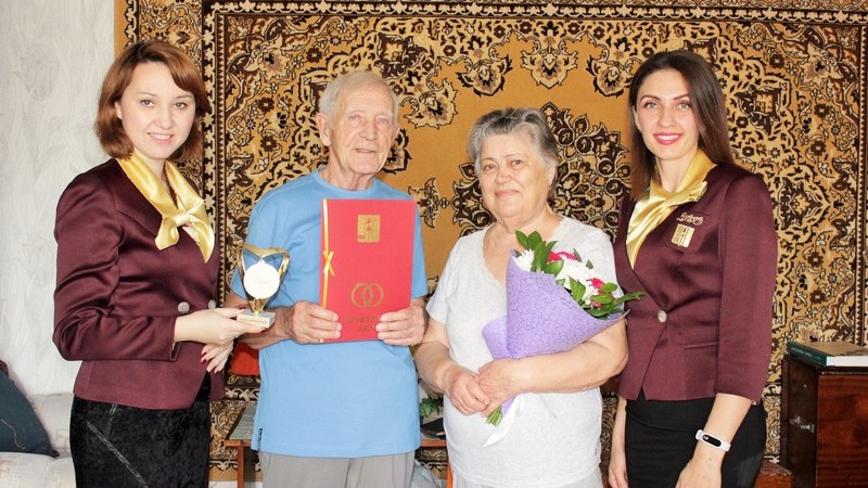 Специалисты Управления ЗАГС вручили Поздравительное обращение от Главы Нижнекамского муниципального района, мэра города Нижнекамска Айдара Раисовича Метшина, Почетный акт Управления ЗАГС и юбилейную медаль. Имена супругов Сумароковых занесены в Книгу Почета Нижнекамского ЗАГСа.