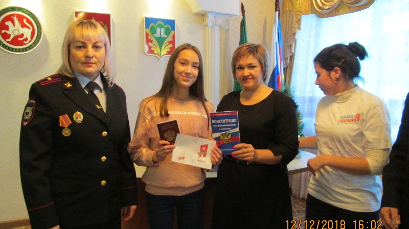 12 декабря в день Конституции России в отделе ЗАГС прошло торжественное мероприятие – вручение первых паспортов. Двенадцать юных кукморян получили свой главный документ из рук старшего инспектора по делам несовершеннолетних майора полиции Гилфутдиновой Гульназ Саубановны.