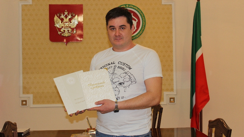 Начальник отдела ЗАГС Сирена Тимерхановна Мурсалимова поздравила счастливого отца с рождением сына, вручила свидетельство о рождении, поздравление Президента Республики Татарстан.