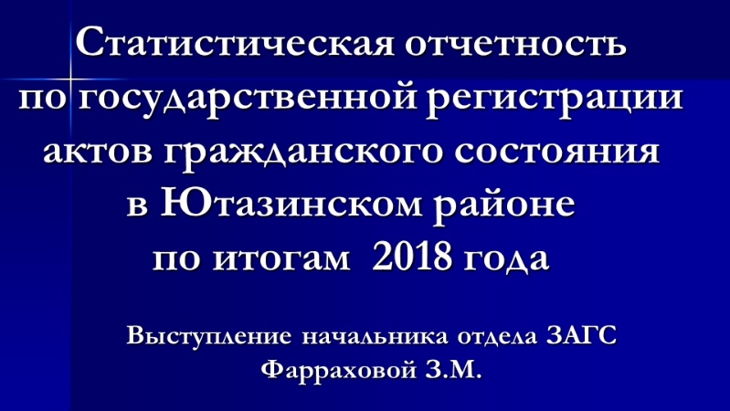 По традиции, каждый год, начальник отдел ЗАГС исполнительного комитета Ютазинского муниципального района Республики Татарстан Фаррахова З.М. выступает на оперативном совещании при главе района и знакомит руководителй с итогами прошедшего года. 18 марта текущего года так же была озвучена информация о демографической ситуации, о статистических данных за 2018 год и о проведенных мероприятиях.