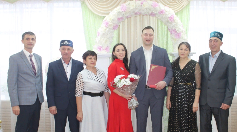В зале торжеств отдела ЗАГС исполнительного комитета Арского муниципального района Республики Татарстан проведена первая церемония бракосочетания 2020 года. Поздравил молодоженов заместитель главы района по социальным вопросам Гарифзянов Р.И. Он вручил им памятный знак в честь 100-летия образования ТАССР, поздравительный адрес главы района Нуриева И.Г., цветы и подарочный сертификат.