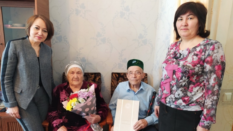 Семью Насыровых с бриллиантовой свадьбой поздравили первый заместитель руководителя исполнительного комитета Ютазинского муниципального района Зульфия Гибадуллина и начальник отдела ЗАГС исполнительного комитета Ютазинского муниципального района Гузалия Фахуртдинова и вручили им памятный подарок.