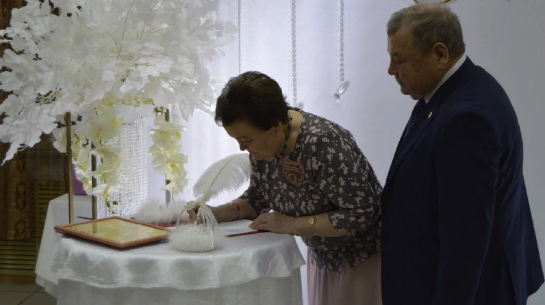 Фоата Галимовича и Розалию Канагатовну поздравила начальник отдела ЗАГС Элфинур Хайрутдинова, вручила им Поздравительный адрес от имени начальника Управления ЗАГС Кабинета Министров Республики Татарстан. Виновники торжества принимали поздравления и от присутствующих на этом празднике родных и близких. Самым волнительным моментом для них стало подписание Книги Почета юбиляров Азнакаевского района.