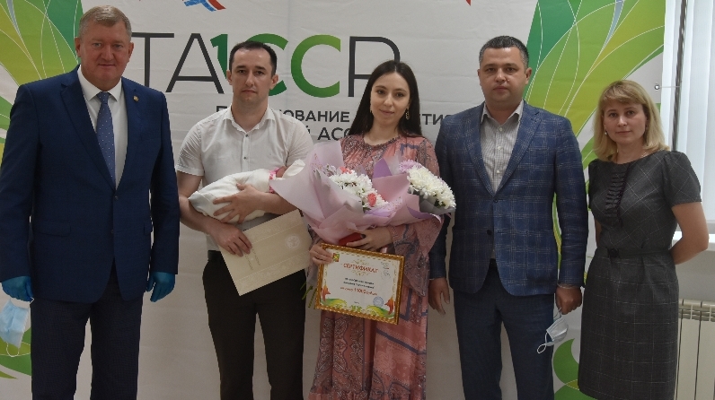 Поздравив с рождением малышки, Глава Заинского муниципального района вручил родителям свидетельство о рождении за №100, памятный подарок и цветы.