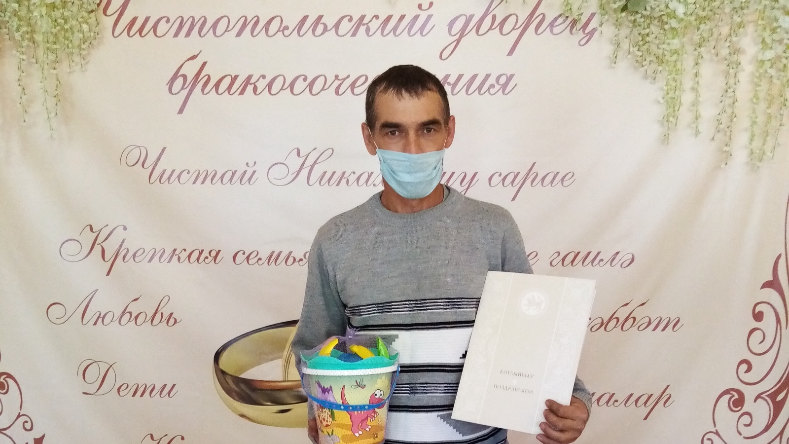 Отцу новорожденной дочери вручили документы и небольшой подарок с пожеланиями благополучия и процветания большой и дружной семье.