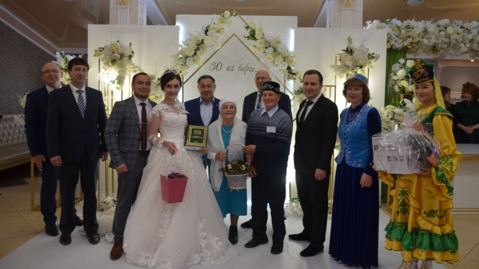 Праздник открылся торжественной регистрацией бракосочетания «золотых» юбиляров. После регистрации со словами поздравления выступили Глава Сабинского муниципального района Минниханов Раис Нургалиевич и Заместитель руководителя Управления Федеральной налоговой службы по Республике Татарстан Никиташин Андрей Геннадьевич.