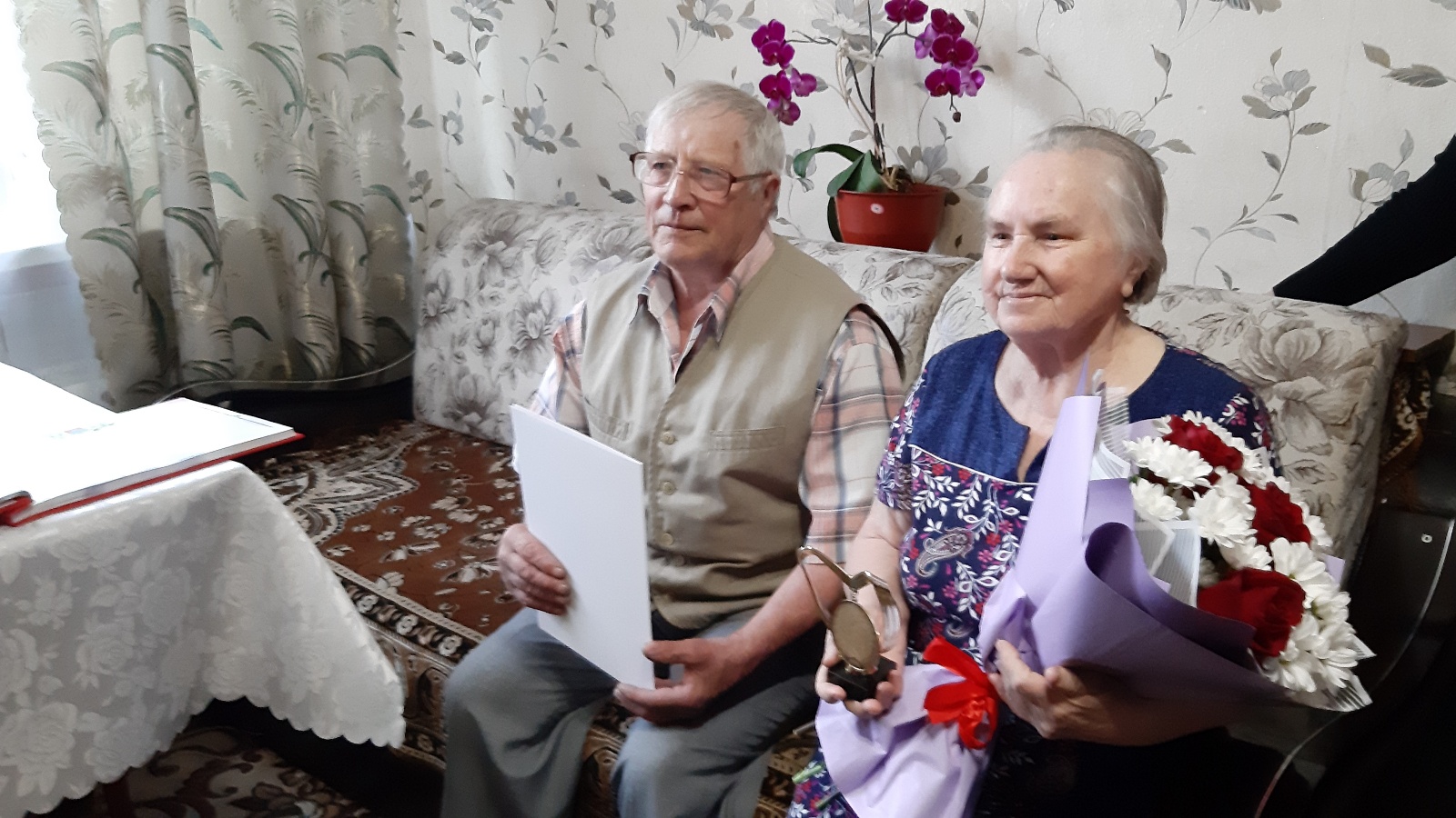 С торжественным событием юбиляров поздравили специалисты отдела ЗАГС и представители общественной организации "Женсовет" Бугульминского района, они пожелали семье благополучия и дальнейшего процветания, вручили поздравительный адрес и цветы от Главы Бугульминского района, Линара Закирова, юбилейные свидетельство и медаль, а также сладкий.
