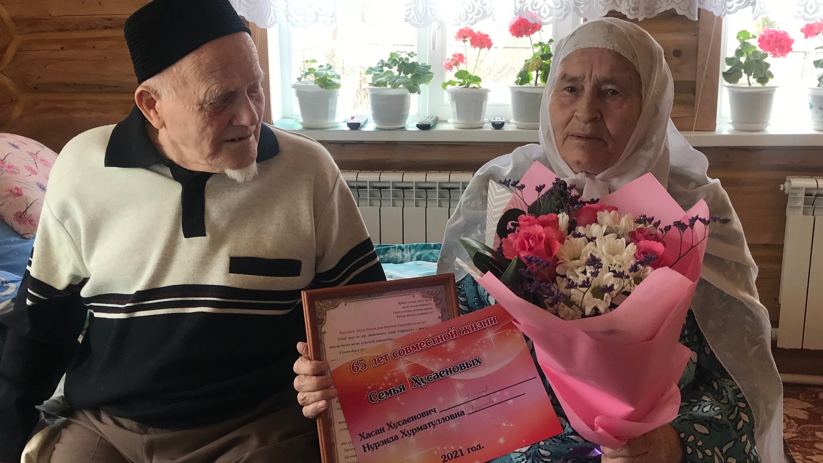 В этом году для четы Хусаеновых юбилейный. Хасан Хусаенович и Нурзида Хурматулловна заключили брак 65 лет тому назад именно в этот день и с тех пор они всегда вместе. Они вырастили 6 замечательных детей. Хасан Хусаенович - заслуженный работник культуры, Нурзида Хурматулловна ветеран труда. За время проживания Хусаеновы показали себя трудолюбивыми, работящими, дисциплинированными работниками, постоянно оказывающими спонсорскую помощь в благоустройстве родной деревни Бурбашский Сардыган. Приветливые и доброжелательные к старшим, внимательные к младшим, дружная семья Хусаеновых пользуется огромным уважением среди односельчан. С этим знаменательным днем юбиляров поздравили начальник отдела ЗАГС Зухра Ахметханова и главный редактор газеты «Хезмэт» Вакиф Закиев.