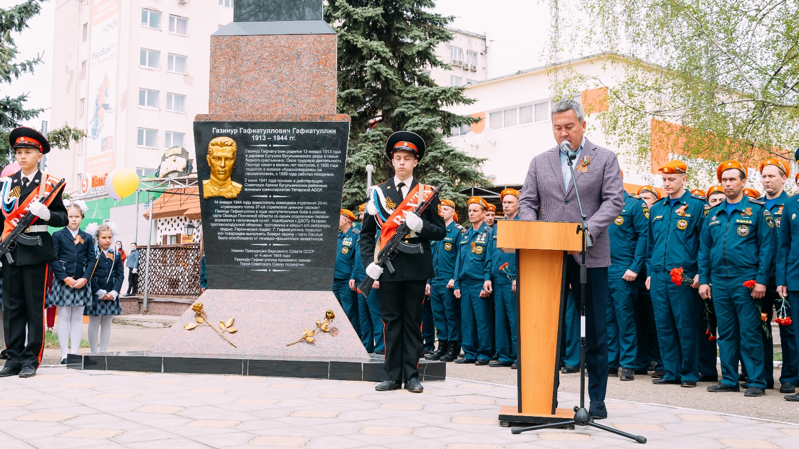 В канун Дня Победы бугульминцы возложили цветы к стеле земляка – Героя Советского Союза Газинура Гафиатуллина, который в годы войны своей грудью закрыл вражеский пулемёт, чем спас сотни жизней боевых товарищей. За героический подвиг в борьбе против немецко-фашистских захватчиков сержант Гафиатуллин удостоен звания Героя Советского Союза и награждением орденом Ленина и медалью «Золотая Звезда».