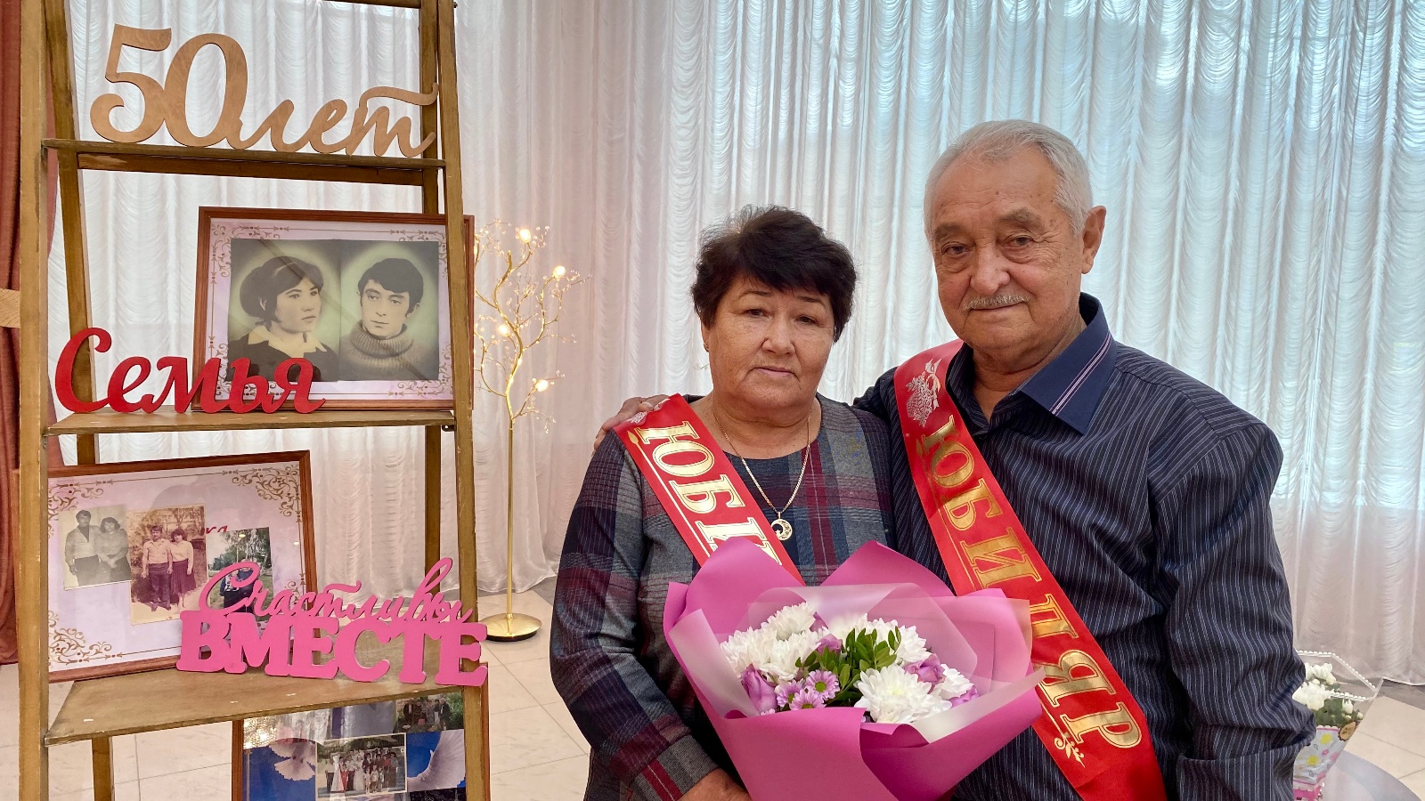 Все как полагается у «золотых» молодожен: подписи в книге юбиляров, почетные ленты, свадебный вальс. Начальник отдела ЗАГС Ландыш Шайхутдинова поздравила супругов с этим прекрасным событием, вручила Благодарственное Письмо от имени Главы района Анатолия Иванова, памятные подарки и цветы, пожелала дожить до свадьбы «железной», которую также с удовольствием пригласила отметить во Дворце Бракосочетания.