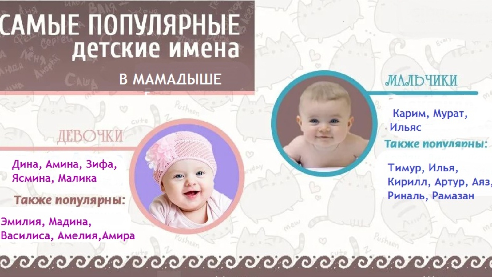 Среди наших детей мы выбрали и самые популярные имена. Среди девочек: Дина, Амина, Зифа, Ясмина и Малика - такими именами назвали четырёх малышек. В числе популярных Эмилия, Мадина, Зиля, Василиса.