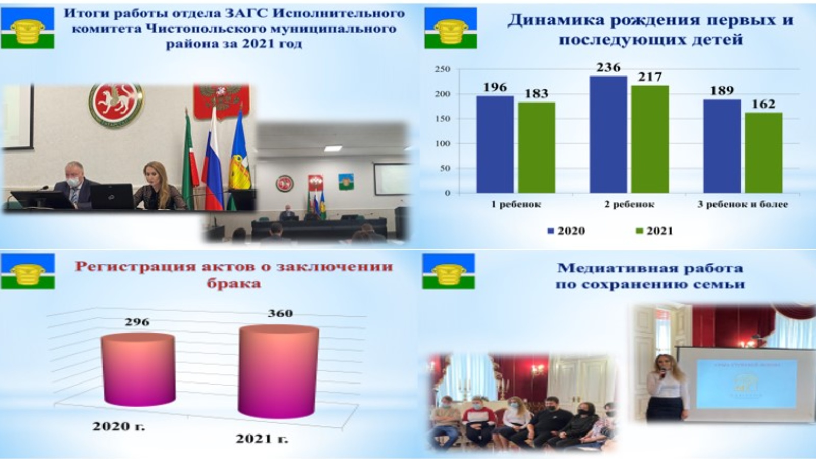 08 февраля 2022 года на городском совещании с участием Главы Чистопольского муниципального района Дмитрия Алексеевича Иванова, руководителя Исполнительного комитета Эдуарда Рустамовича Хасанова, руководителей предприятий и организаций района с информацией отдела ЗАГС Исполнительного комитета Чистопольского муниципального района по итогам работы в 2021 году выступила начальник отдела ЗАГС Динара Наилевна Залялова.