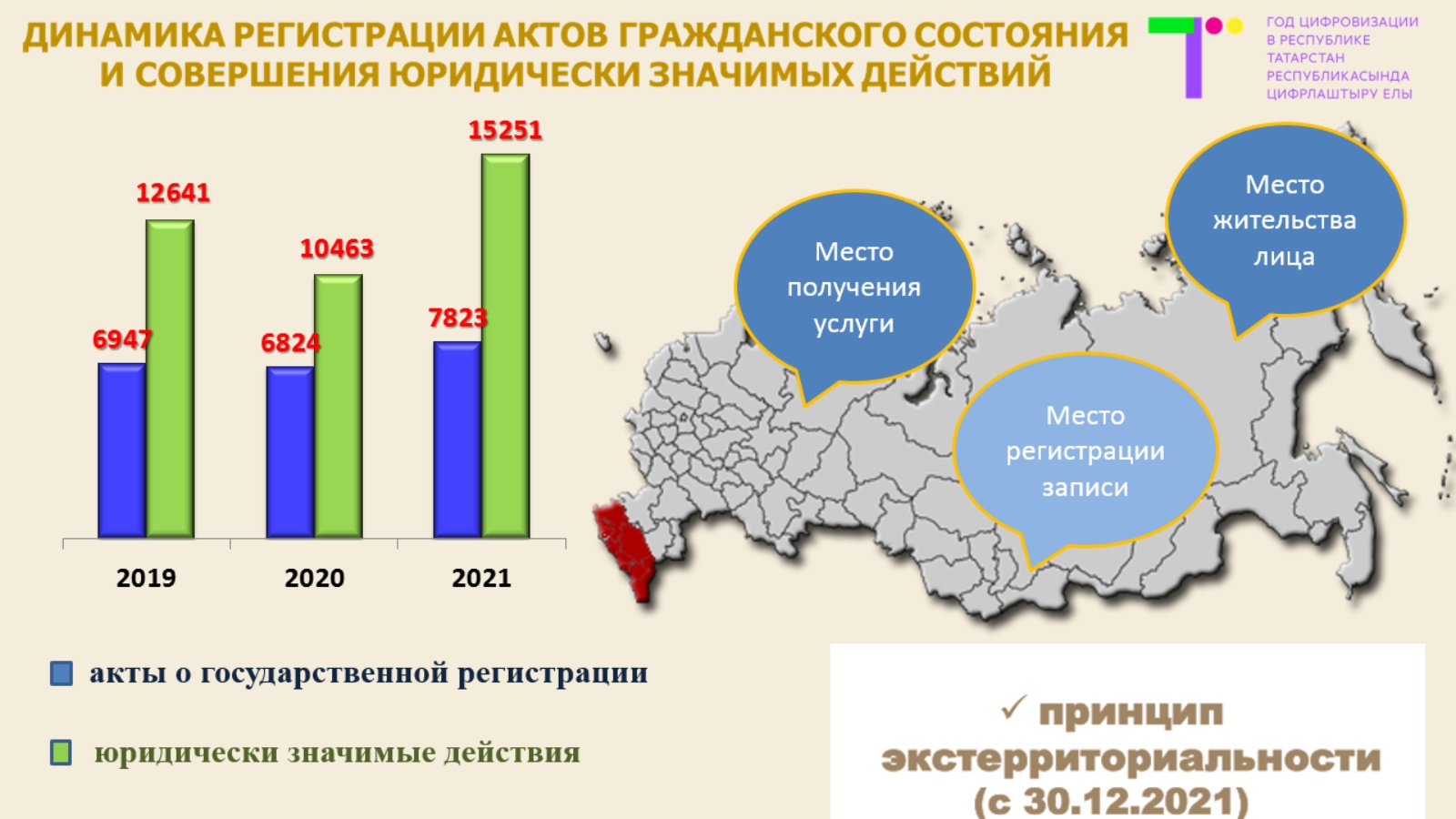 14 февраля 2022 года на общегородской планёрке с участием Главы подведены итоги деятельности по государственной регистрации актов гражданского состояния Управления ЗАГС исполкома района за 2021 год и обозначающего задачи на 2022 год. Начальник Г. Р. Амирова сообщила о том, что услуги, связанные с государственной регистрацией актов гражданского состояния с 30 декабря 2021 года предоставляются по экстерриториальному принципу, то есть независимо от места жительства заявителя. Отметила, что актов гражданского состояния в отчетном году зарегистрировано больше на 1002 акта, совершенно более 15 тысяч юридически значимых действий.