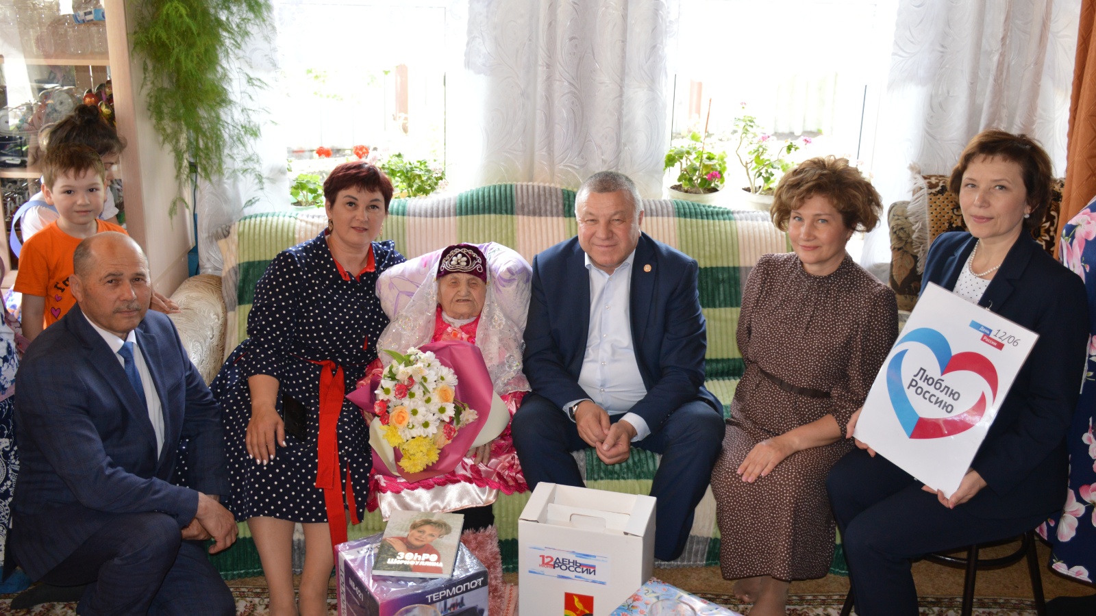 10 июня жительнице с. Карашай-Саклово Сармановского муниципального района Шайдуллиной Закии Насибулловне исполнилось 103 года. С знаменательным днем ветерана поздравил Глава района Фарит Хуснуллин и вручил благодарственное письмо, памятный подарок. К поздравлениям присоединились заместитель руководителя исполнительного комитета муниципального района Индира Сахипова, начальник отдела ЗАГС Гульчачак Валишина, Глава Карашай-Сакловского сельского поселения Вероника Вячеславовна, председатель Совета ветеранов Асыляр Харисов, родные и близкие.