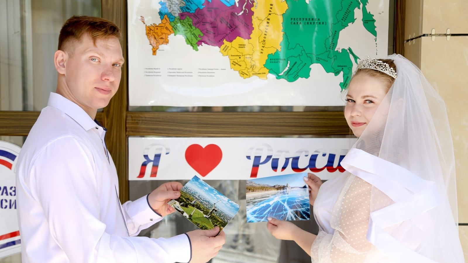 Вместе с молодоженами сотрудники украсили окна Дворца бракосочетания наклейками с изображением символики Российской Федерации и достопримечательностей нашей необъятной Родины.