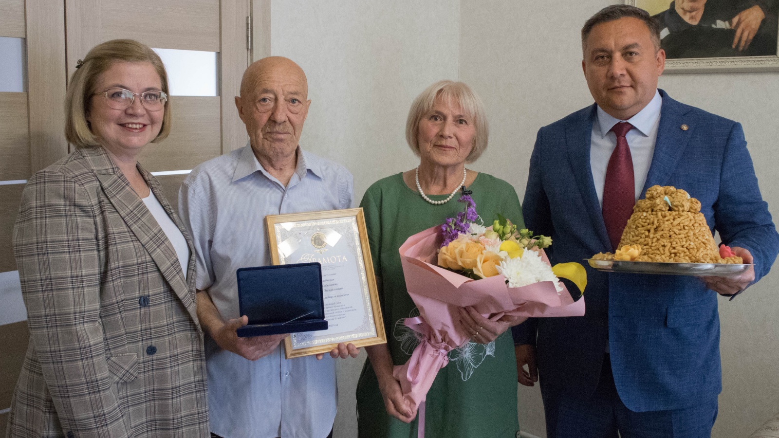 Медаль «За любовь и верность» золотым юбилярам — супругам Вилю Сабировичу и Венере Загидулловне Миндубаевым из села Высокая Гора вручила начальник Управления ЗАГС Кабинета Министров Республики Татарстан, координатор ФПП «Крепкая семья» в Республике Татарстан Г.Р. Нигматуллина. Церемония состоялась в преддверии празднования Всероссийского Дня семьи, любви и верности, в рамках которого такими медалями будут награждены 70 заслуженных татарстанских семей. В мероприятии принял участие и поздравил юбиляров руководитель Исполнительного комитета Высокогорского муниципального района Р.Ф. Хисамутдинов.