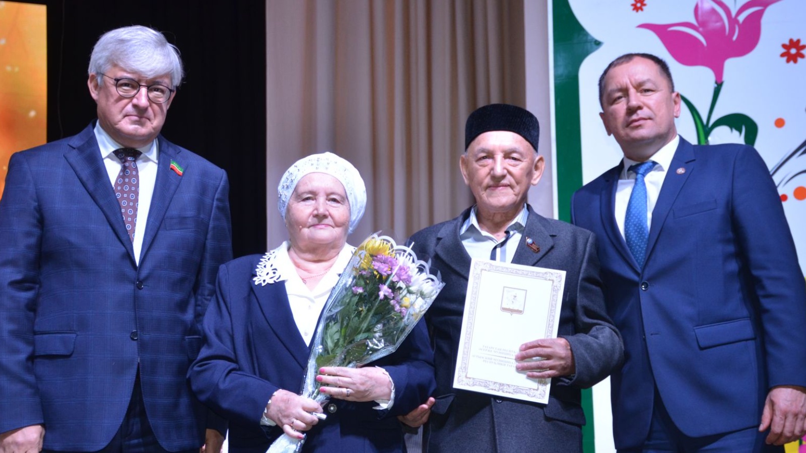 В этот прекрасный день на сцене были награждены одни из тех семейных пар, на которых следует равняться. Семья Садыковых Баязита и Тихнии, которые отмечают 55 лет совместной жизни! Баязит Баянович всю свою жизнь посвятил Агрызской районной эксплуатационной газовой службе, Тихния Шаеховна 30 лет проработала в торговле.