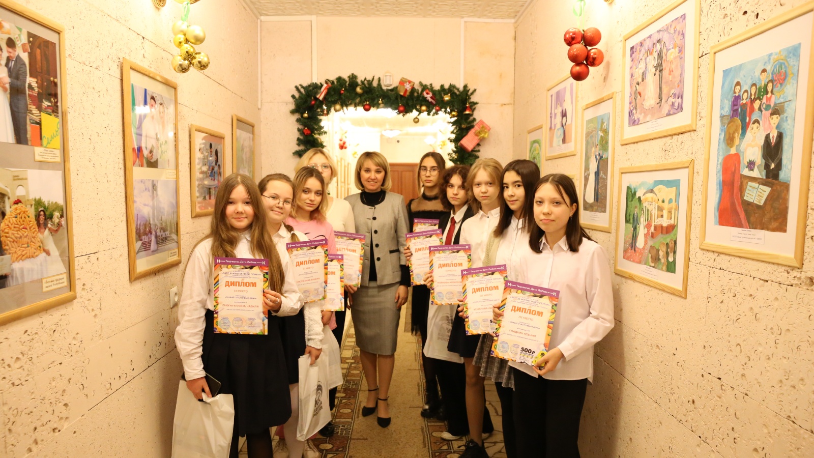Начальник Управления ЗАГС Нижнекамского муниципального района Гузялия Сагитова поздравила ребят с победой в конкурсе и вручила дипломы и подарки от депутата Нижнекамского городского Совета Ильнара Сираева и партии «Единая Россия».