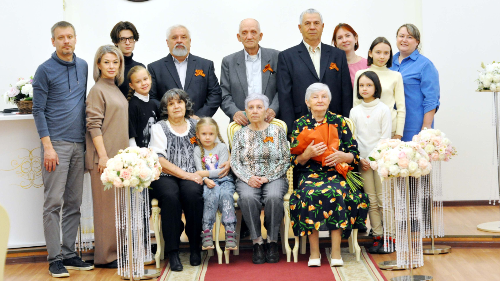 «Бриллиантовые» юбиляры Комиссаровы Юрий Андреевич и Нинель Викторовна поделились воспоминаниями о своих родителях. Отец Нинель Викторовны с 1941 по 1945 год был военным летчиком, а отец Юрия Андреевича– тружеником тыла. «Золотые» юбиляры Рахматуллины Зифер Шайхиевич и Саимбика Файзулловна рассказали о своих отцах - участниках Великой Отечественной войны. Медалями «За отвагу», «За взятие Кёнигсберга» награжден был отец Галины Александровны Антоновой, о тяжелом труде своих родителей, тружениках тыла, рассказал Вадим Алексеевич Антонов («золотые» юбиляры супружеской жизни).