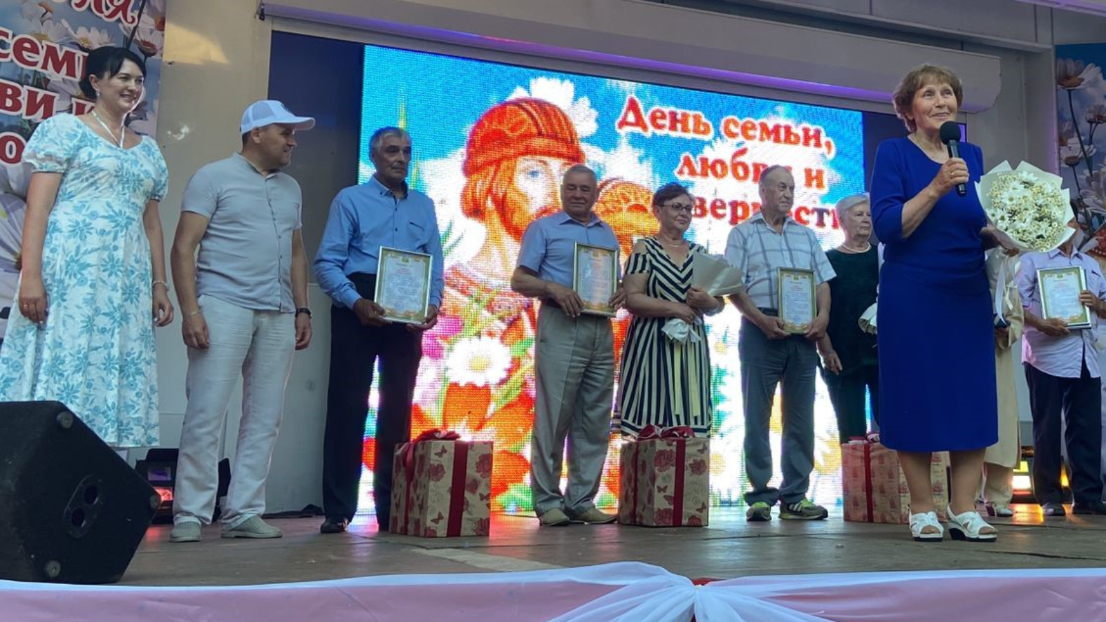 По сложившейся традиции, в этот день на сцене чествовали семьи, которые прожили в браке много десятков лет и отмечают в 2023 году юбилеи совместной жизни. Это золотые юбиляры: супруги Владимир и Татьяна Кудряшовы, Ринат и Ляля Хасановы, Иван и Тамара Афанасьевы, прожившие в любви и верности 50 лет. Торжественно вручена медаль «За любовь и верность» золотым юбилярам - Мансуру Зиннатовичу и Зульфире Гизатулловне Хисматуллиным.