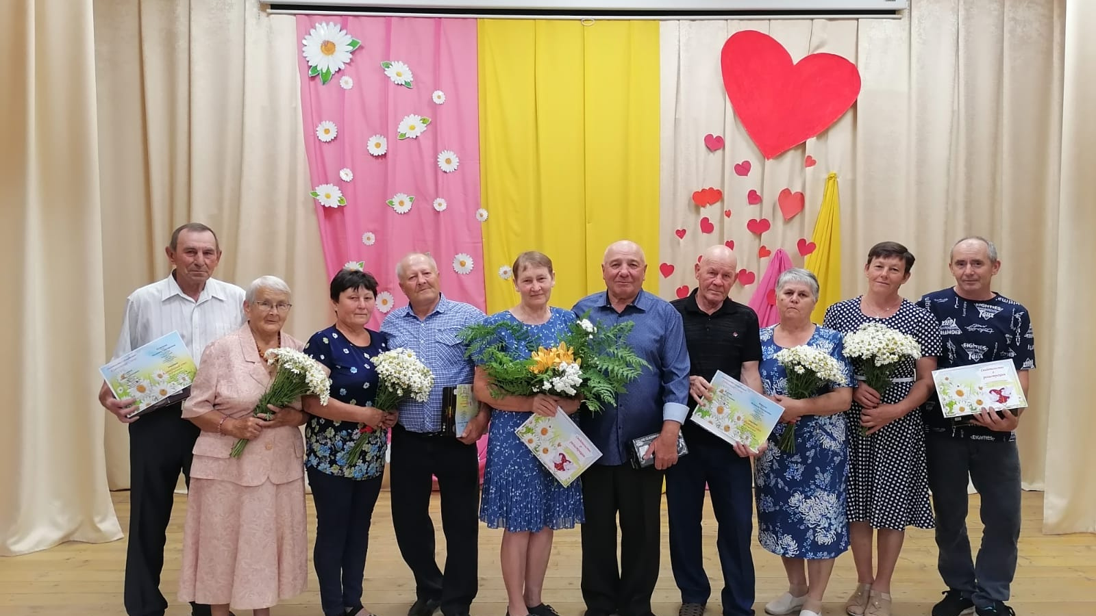 Чернов Алексей Иванович и Антонина Егоровна прожили в любви и согласии 60 лет и отметили Бриллиантовую свадьбу. В этом году семья Захаровых Виктора Павловича и Ольги Ивановны отметили Золотую свадьбу. Кузнецовы Леонид Алексеевич и Антонида Григорьевна празднуют жемчужную, Черновы Андрей Александрович и Нина Васильевна полотняную свадьбу. Семьи Жирновых Василий Петровича, Феодосии Максимовны и Сергеевых Семена Викторовича и Валентины Михайловны отмечают рубиновые свадьбы.