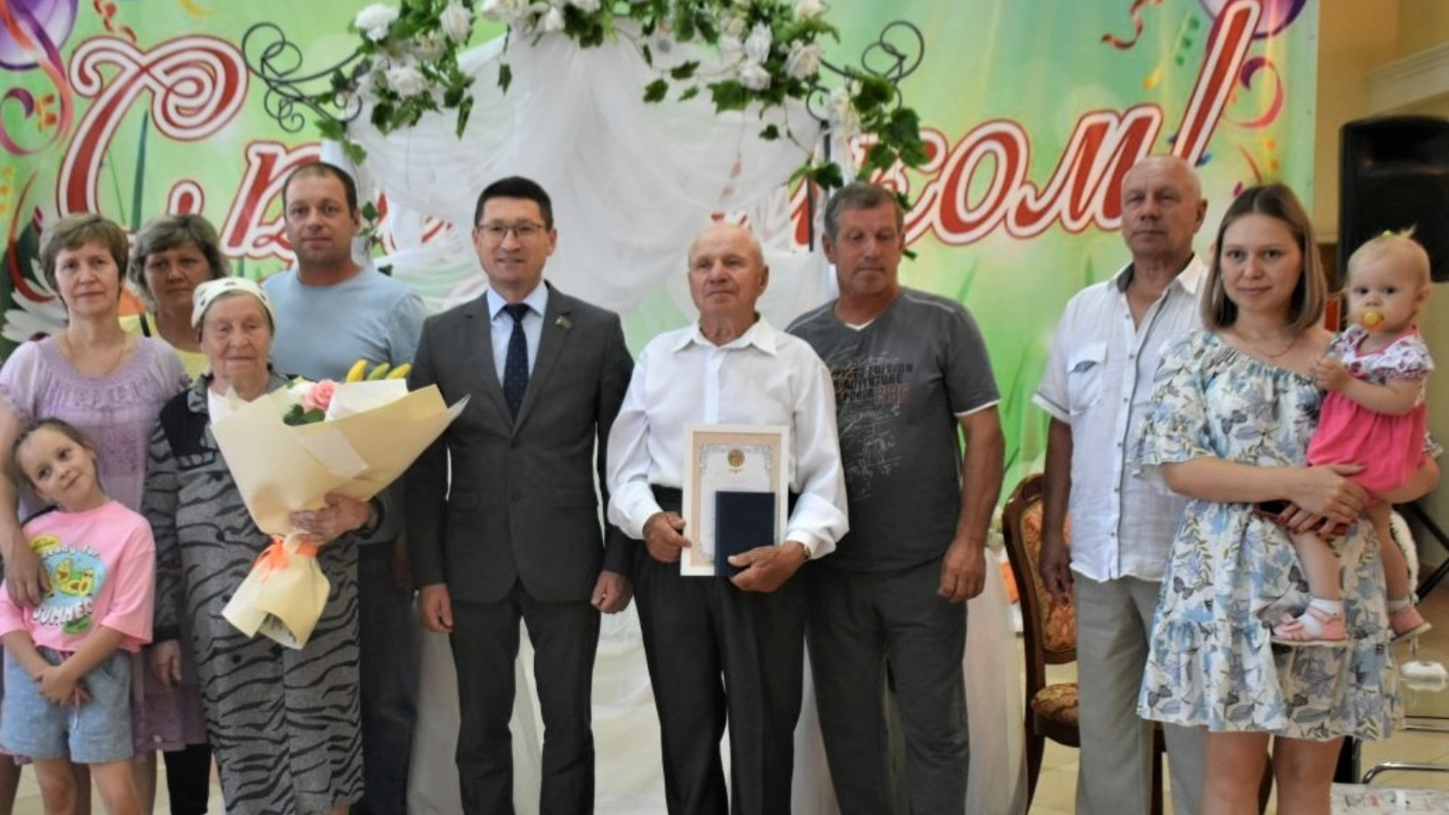 Глава района Ильхам Кашапов тепло поздравил виновников торжества, вручил медаль «За любовь и верность» и памятный подарок.
