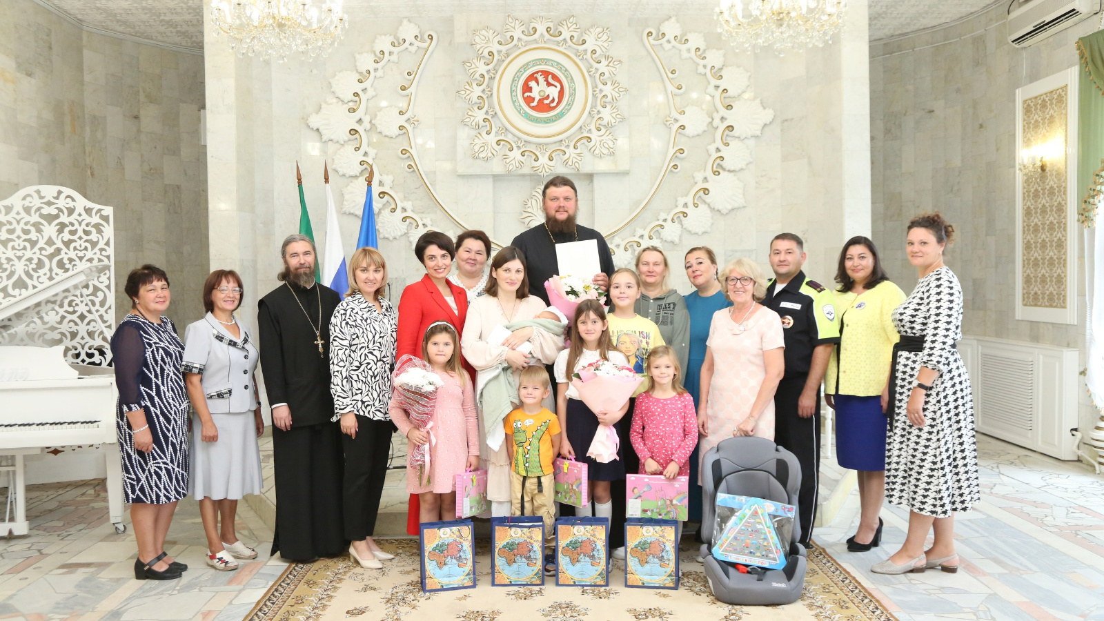 Специалисты Управления ЗАГС вручили семье Добрыниных первый документ малыша – свидетельство о рождении, и подарили памятные книги. Заместитель начальника отдела ГИБДД Управления МВД России по Нижнекамскому району Фархутдинов Вадим Радифович поздравил многодетную семью с рождением сына и вручил в подарок автокресло.