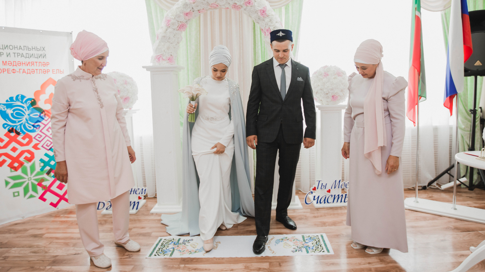 В Арском районе широко распространен традиционный ритуал угощения молодоженов чак-чаком, чтобы слова, сказанные друг-другу, были такими же сладкими и подстилание родителями под ноги новобрачных символической семейной дорожки - полотенца с пожеланиями благополучной семейной жизни.