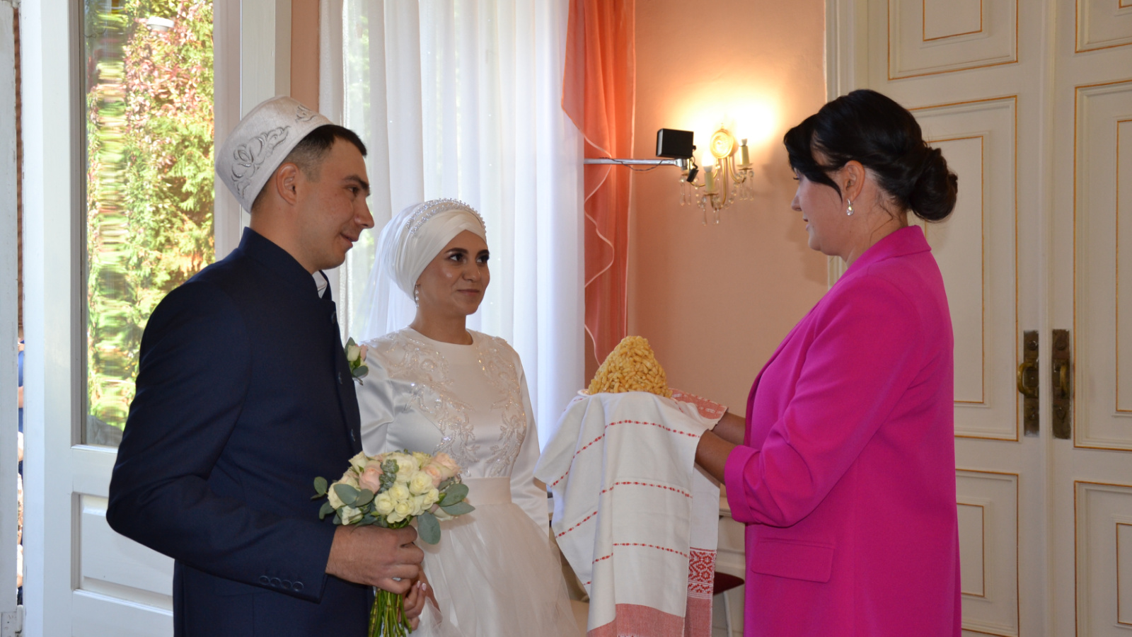 Учитывая предпочтения молодых, регистрация велась на татарском языке. После государственной регистрации молодые направились для проведения обряда никах по канонам мусульманской религии.