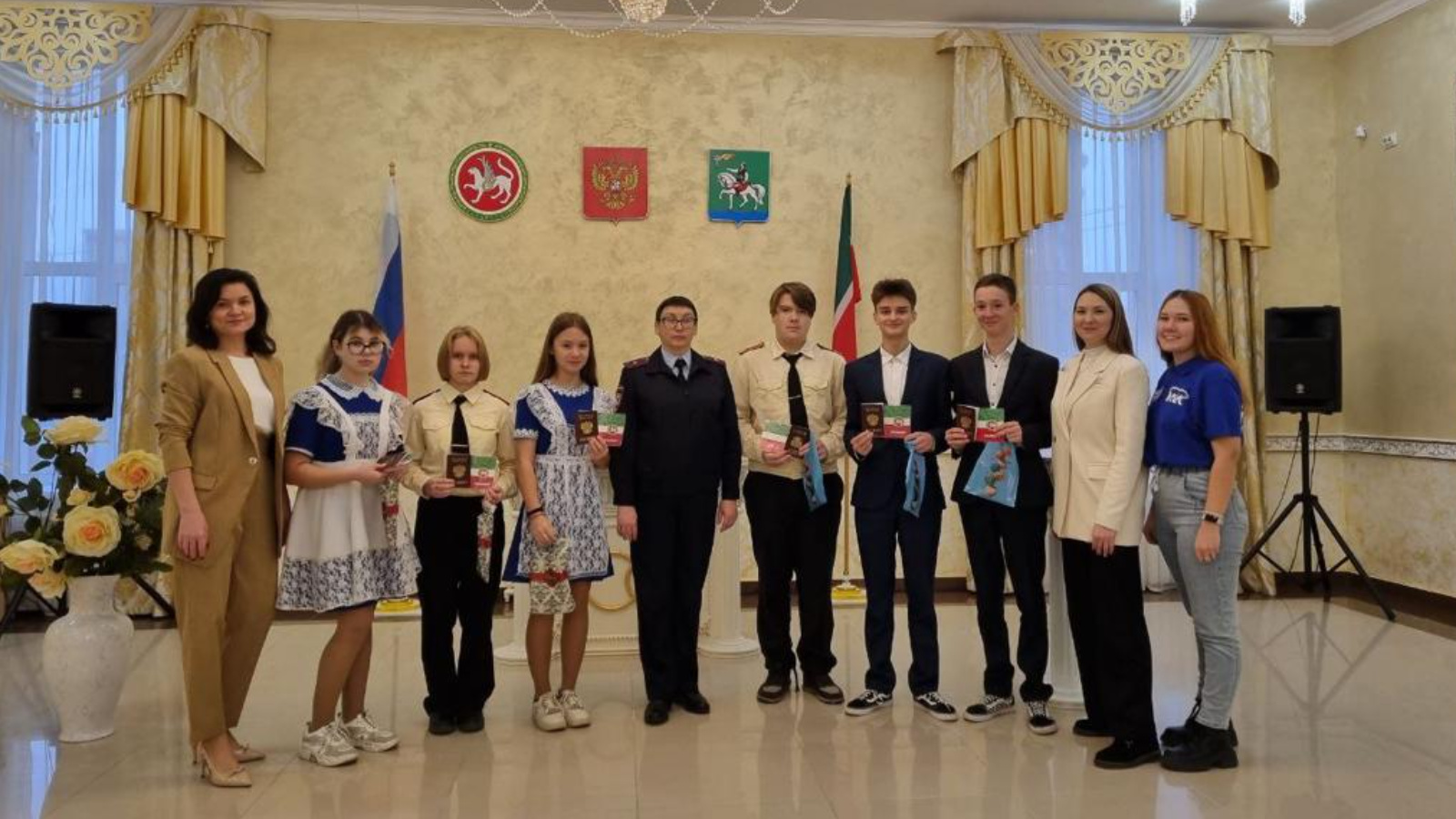 В отделе ЗАГС Исполнительного комитета Агрызского муниципального района Республики Татарстан вручили паспорта 14-летним школьникам. Свой главный документ, удостоверяющий личность, в торжественной обстановке получили шесть юных жителей города. С приветственным поздравлением ко всем ребятам обратилась начальник отделения по вопросам миграции ОМВД России по Агрызскому району - Агрыз, капитан полиции Шадрина Елена Рафаэлевна. Сотрудник полиции и работники отдела ЗАГС поздравили ребят с новым жизненным этапом, пожелали им достойно и с гордостью носить паспорт гражданина Российской Федерации, быть законопослушными гражданами страны. После торжественного и волнительного для ребят вручения паспортов, они сделали совместную фотографию на память, на которой юные граждане России с гордостью демонстрировали свой первый взрослый документ, удостоверяющий личность – паспорт гражданина России, а представители «Молодой гвардии» партии Единой России подарили ребятам памятные подарки.