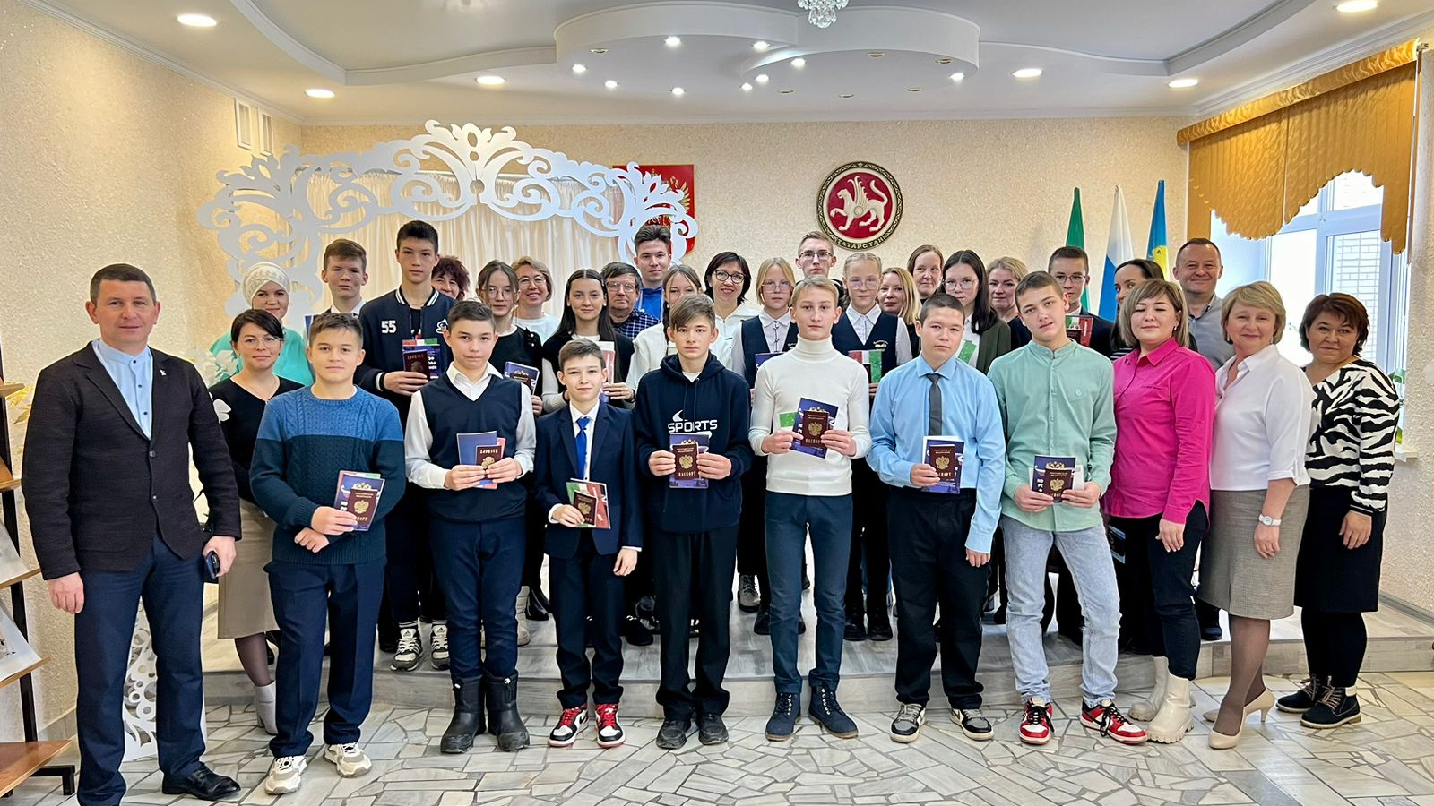03 ноября 2023 года в преддверии Дня народного Единства в отделе ЗАГС 16 юным балтасинцам были вручены их первые паспорта гражданина Российской Федерации. Это особое событие было отмечено в торжественной обстановке, в которой присутствовали родители и близкие. Быть гражданином России – это высокая честь. А получение паспорта – это большое и волнующее событие в жизни каждого подростка. Главный документ с добрыми пожеланиями торжественно вручил заместитель руководителя Балтасинского районного исполнительного комитета Ильгам Гайнутдинов. На мероприятии вручения представитель партии «Единая Россия» Айрат Хайруллин, руководитель российского движения молодежи «Движения первых» Альфия Такиева, специалист отдела молодежи и спорта Айсылу Нуриева поздравили ребят с этим знаменательным событием и пожелали стать достойными гражданами своей страны.
