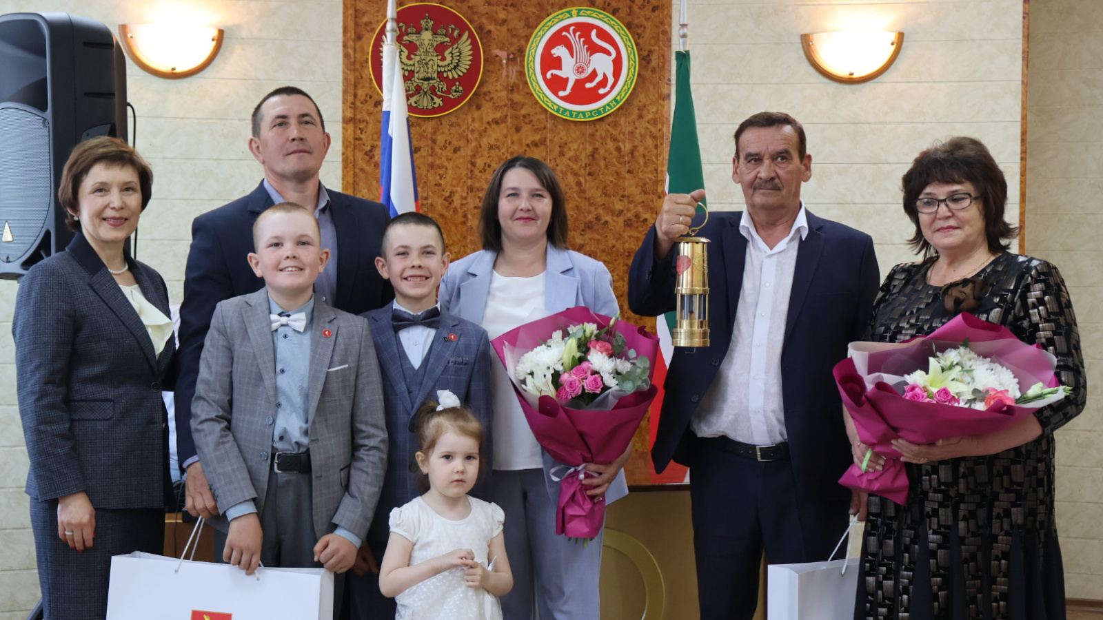 Сегодня символ был передан в Альметьевский муниципальный район. Это почетное право было представлено многодетной семье Наркиза и Лилии Мухаметовых из с. Сарайлы Сармановского района. В активной, дружной семье Мухаметовы воспитывают двух сыновей Назиля, Нурзиля и дочку Лейлу. В ноябре этого года супруги отметят свою хрустальную свадьбу.