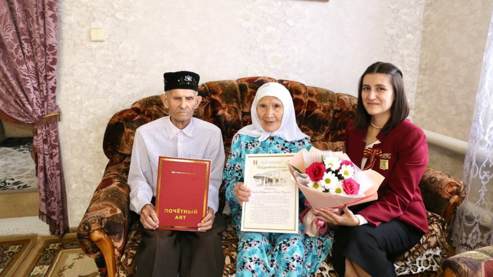 В качестве знака уважения и признания, сотрудники Управления ЗАГС вручили труженикам тыла поздравительный адрес и памятные подарки. В свою очередь супруги Ахметзяновы поставили свои подписи в почетной книге юбиляров.