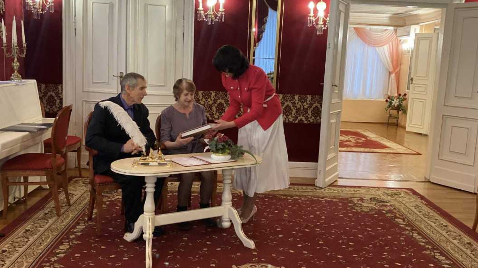 В день «золотого» супружеского юбилея, супруги расписались в книге почетных юбиляров Чистопольского Дворца Бракосочетания.