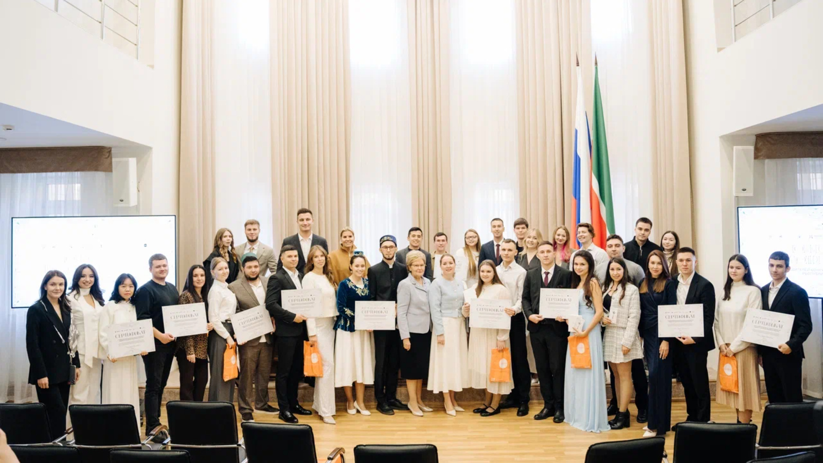 Сертификаты молодождены получили от рук Татьяны Петровны Ларионовой - Депутата Государственной думы Федерального собрания Российской Федерации VIII созыва, член комитета Государственной Думы по вопросам семьи, женщин и детей. И Эльвиры Фанисовны Ахметовой – руководителя Управления ЗАГС Кабинета Министров Республики Татарстан, регионального координатора ФПП «Крепкая семья».