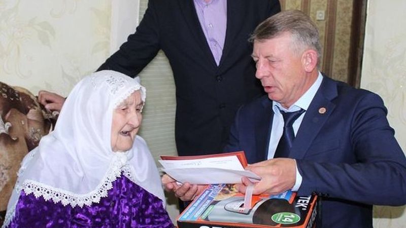 Кунаклар юбилярга Россия Федерациясе Президенты Владимир Путин исеменнән котлау открыткасы һәм район башлыгы исеменнән бүләк тапшырдылар. Сәламәтлек, иң яхшы һәм иминлек теләделәр.