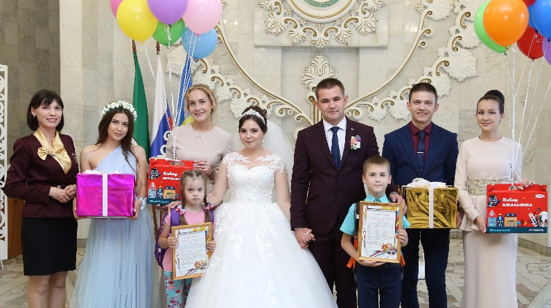 Барлык өйлəнешүчелəр исеменнəн Фаил һəм Әдилə Файзуллиннар язылышу тантанасыннан соң ГХАТ Идарəсе хезмəткəрлəре белəн уку əсбапларын һəм букчаларны Низамов Ранил һəм Аппакова Эмилиягə тапшырдылар.